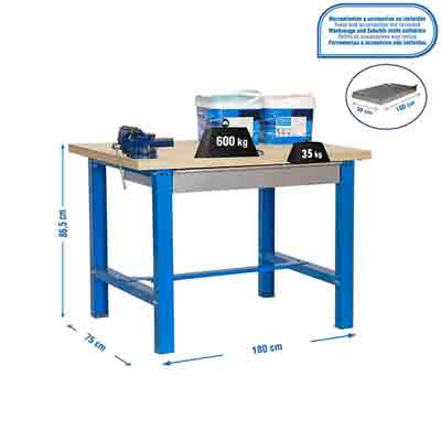 Capacité : 600 Kg Matière : MDF Couleurs : Anthracite/MDF, Bleu/MDF, Gris/MDF Dimensions : 865 x 1500 x 750 mm ou 865 x 1800 x 750mm