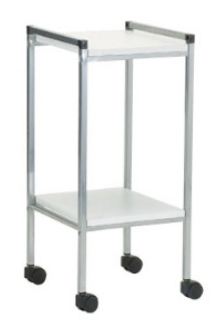 Ce guéridon médical, doté de 2 plateaux en bois stratifié blanc (suivant le modèle) et de 4 roulettes pivotantes noires de diamètre 5 cm.