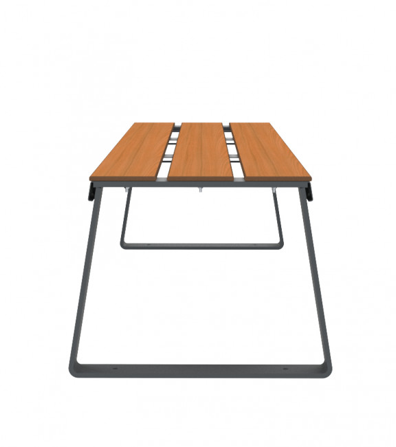 L’assise est constituée de lames en compact HPL, un matériau technique particulièrement adapté au mobilier extérieur.