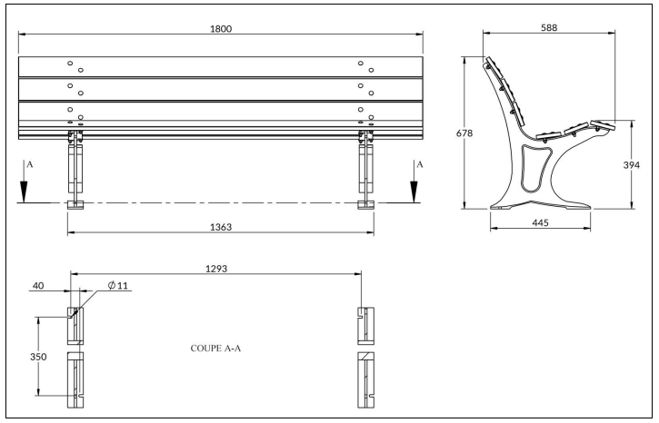 Longueur : 1800 mm Hauteur d'assise : 394 mm Lames en bois Stratifié compact HPL Piétement : Fonte FGL250 Chevillage sur sol béton