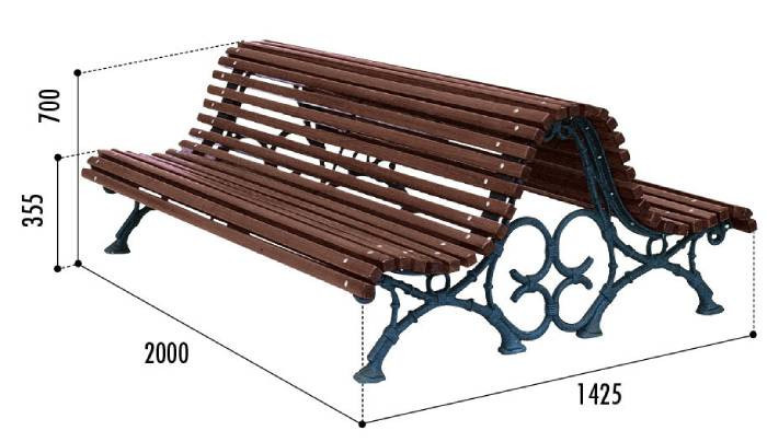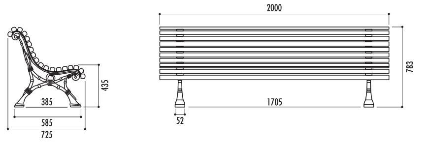 Disponible en modèle simple (18 lames) ou double (35 lames), ce banc mesure 2000 mm de longueur avec une hauteur d’assise de 355 mm.