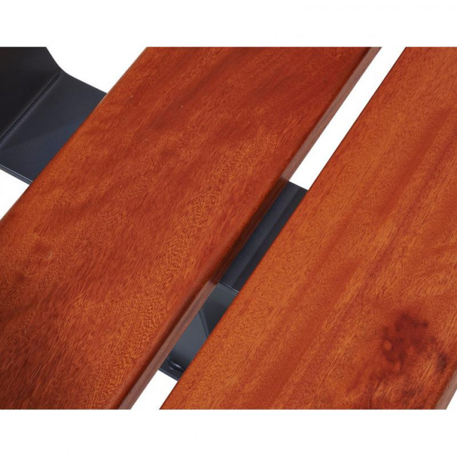 - Assise et dossier : en bois exotique épaisseur 36 mm, finition lasurée (chêne clair ou acajou).