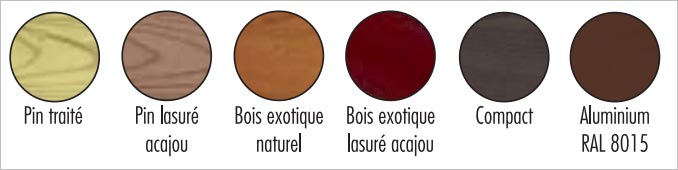 - Pin traité - Pin lasuré acajou - Exotique naturel - Exotique lasuré acajou - Aluminium |