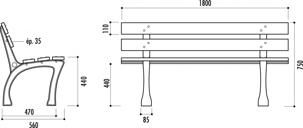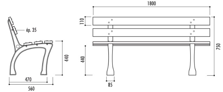 Avec une longueur de 1800 mm, ce banc public pieds fonte accueille simultanément 3 à 4 personnes.