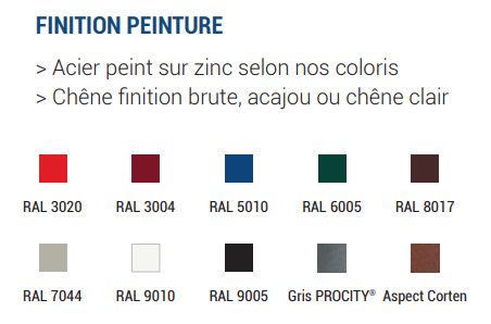 L’acier peint sur zinc est disponible selon 10 coloris standards : Gris Procity, Blanc pur (RAL 9010), Bleu gentiane (RAL 5010), Rouge signalisation (RAL 3020), Noir foncé (RAL 9005), Gris soie (RAL 7044), Rouge pourpre (RAL 3004), Vert mousse (RAL 6005), Brun chocolat (RAL 8017), Aspect Corten. D’autres coloris RAL sont disponibles sur demande.