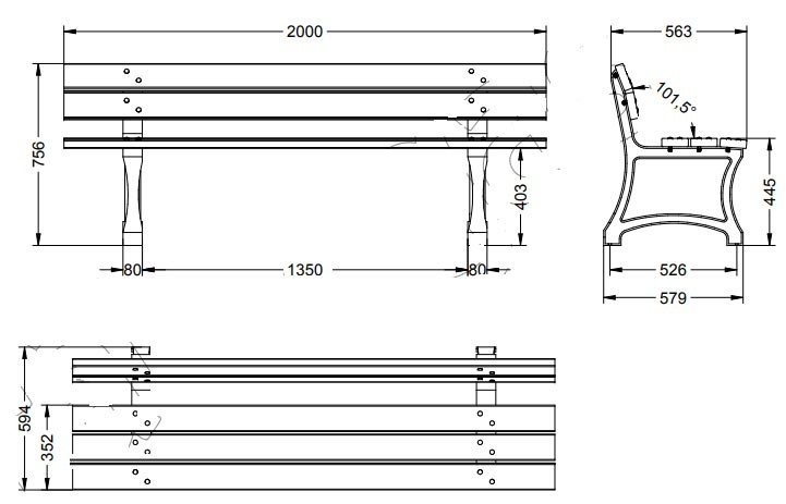Banc public en bois - Longueur : 2000 mm - A sceller