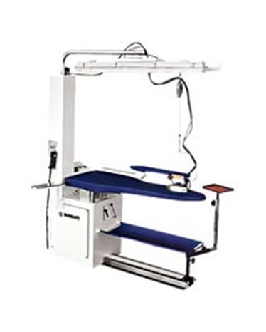 Cette table aspirante soufflante avec fer et chaudière est un poste de travail de finition du linge qui assure le repassages de vêtements.