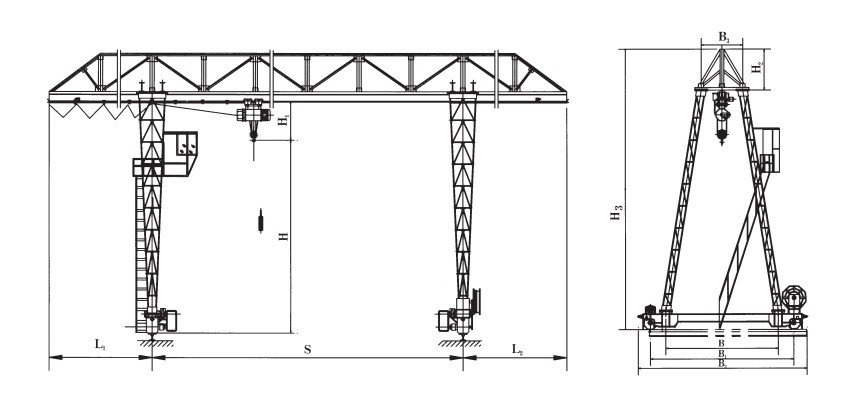 - Ce portique peut être conçu avec une poutre en treillis simple ou une poutre en treillis double, de sorte que le mécanisme de levage peut être un palan monorail ou un palan de type chariot.