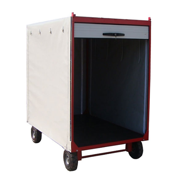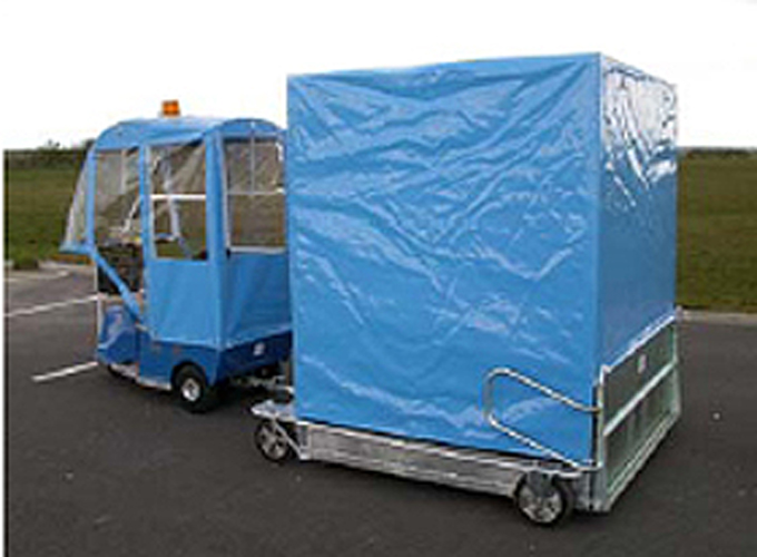 Remorque abritée pour transporter des sacs de linges tirer par un traceur électrique, Dimensions: environ 1m20/ 2 à 2m50.