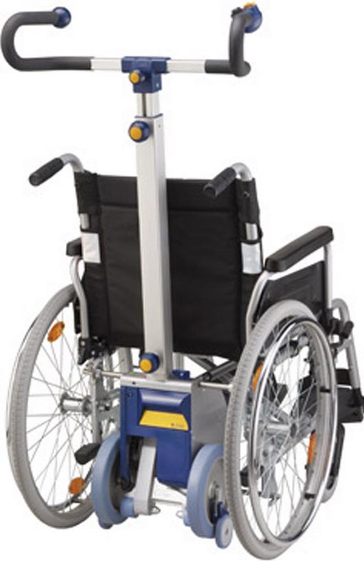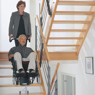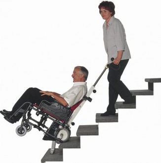 Aide à faire monter une personne en fauteuil roulant dans les escaliers