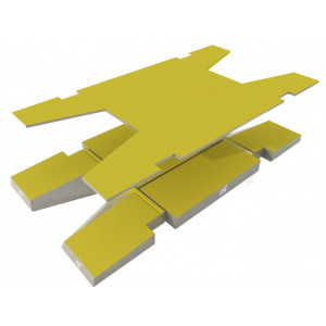 Les tapis possédent un dessous antidérapant, des pognées de transport et des bavettes agrippantes en périphérie sur le dessus pour lier les matelas entre eux et former une surface de réception homogène.