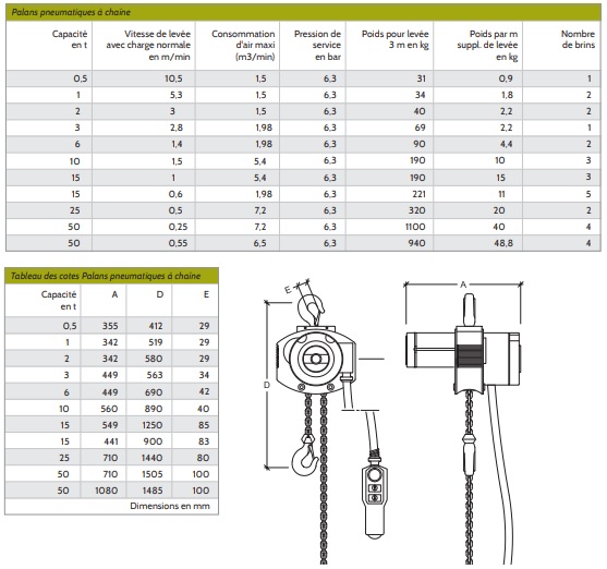 La capacité des palans pneumatiques peut varier de 0,5 tonne à 50 tonnes. Cela signifie que ces palans sont capables de supporter des charges allant de 0,5 tonne à 50 tonnes en une seule opération.