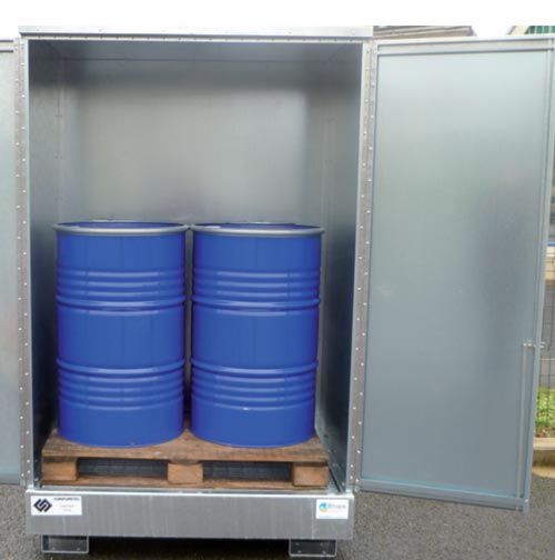 Le Box de stockage en acier galvanisé avec bac de rétention convient pour le stockage jusqu'à 2 fûts de 440 litres.