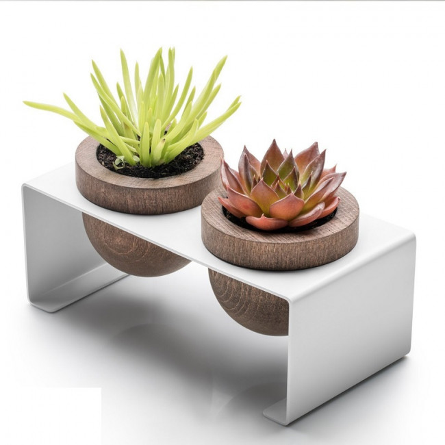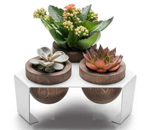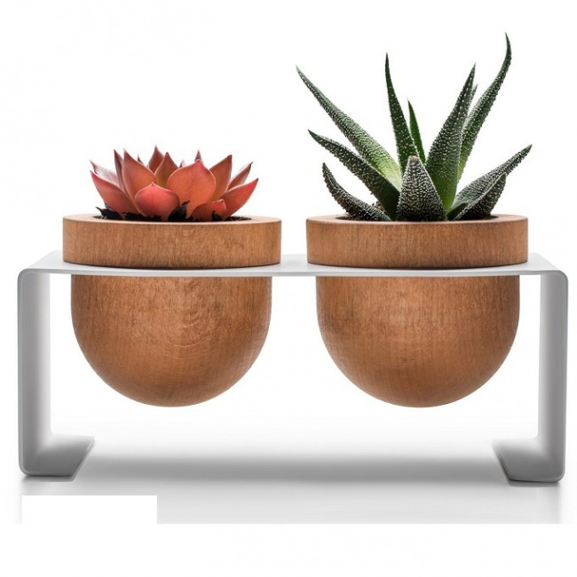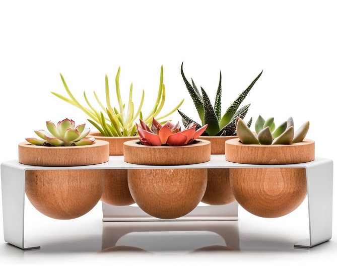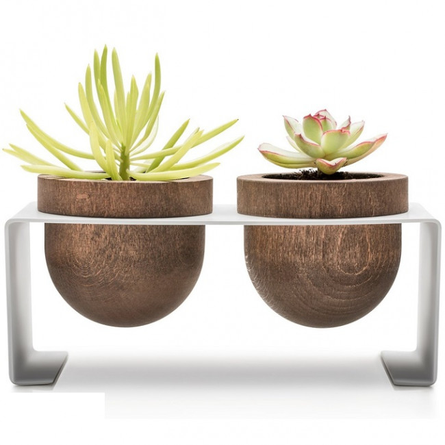 Les pots ronds en chêne ou en noyer semblent flotter dans les airs grâce à leur support en métal épuré.