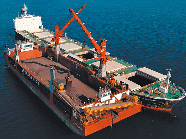 Grue de navire avec grappin à quatre câbles permet une exploitation en continu ainsi qu'une manutention tout aussi rapide qu'efficace de charbon, de minerai et de marchandises en vrac.