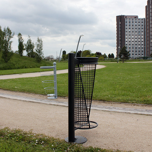 Nous vous conseillons cette corbeille grillagée à sceller ultra résistante type Vigi-Pirate pour aménager les espaces publics.
