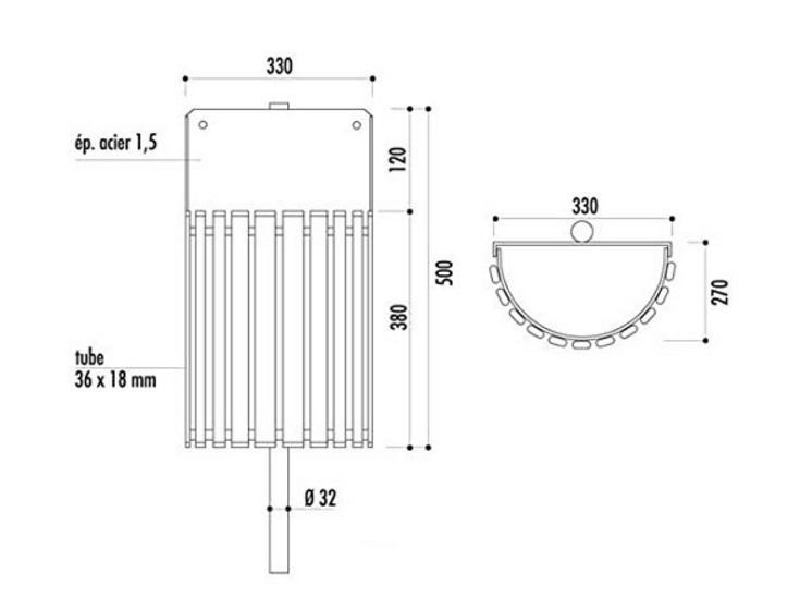 Capacité : 30 L Structure en acier tubes méplas Dimensions : H. 500 x l. 330 mm Fixation murale ou sur poteau