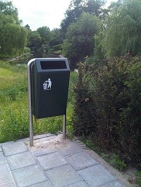 Cette poubelle publique s’installe solidement grâce à un support en tube d’acier galvanisé avec deux pieds et quatre points de fixation au sol.