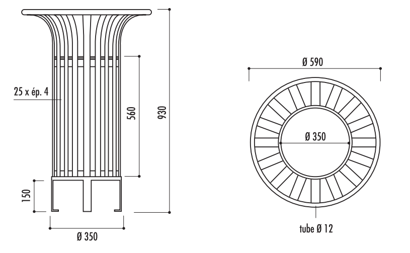 Elle est composée d'une structure en fer plat 25 x 4 mm, équipée d'un anneau porte sac Ø 360 mm.