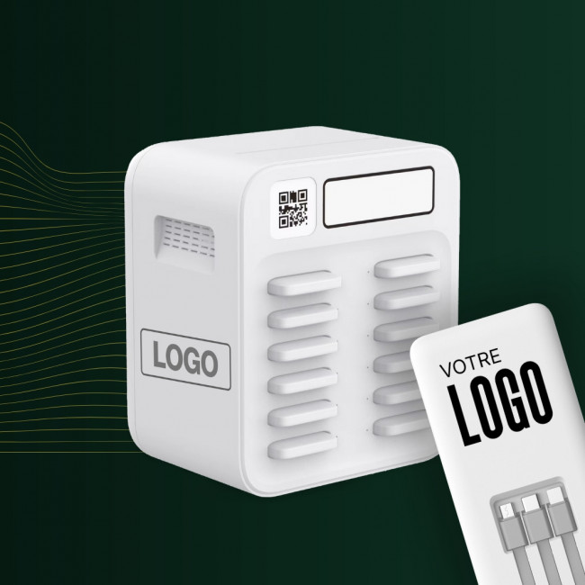 - 12 batteries portables en libre-service avec câbles intégrés (Lightning, Micro USB, USB C)