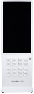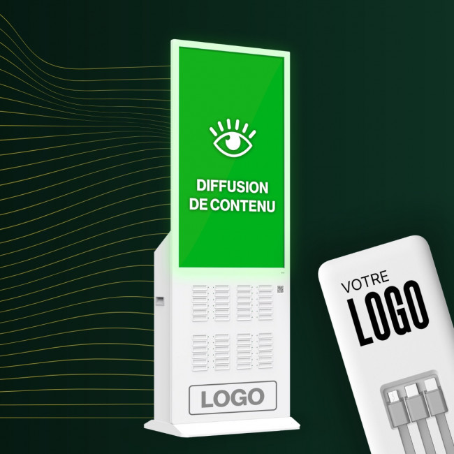 Cette borne de recharge pour téléphones mobiles est équipée de 48 batteries portables éjectables, offrant une solution de recharge 100% autonome.