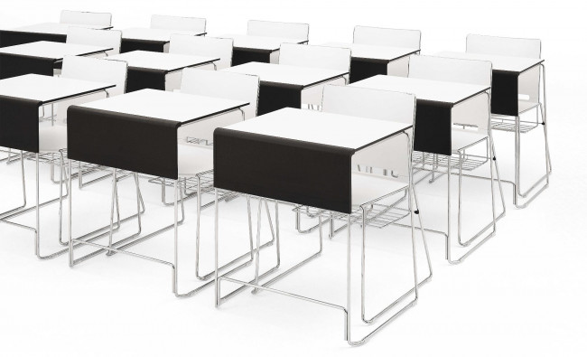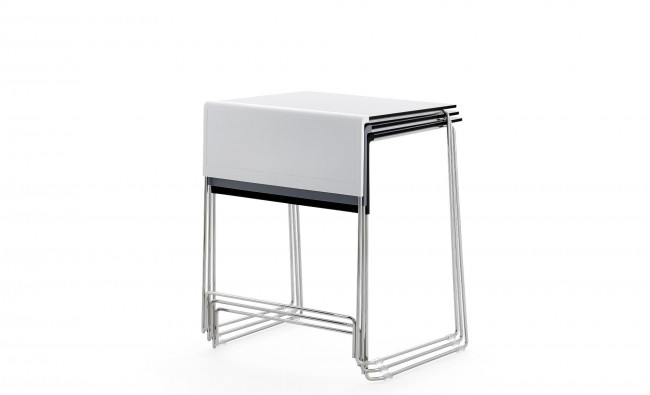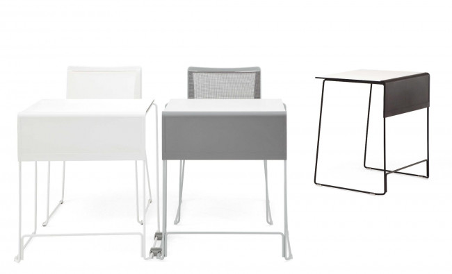 Son plateau en HPL résistant est soutenu par un piétement disponible en trois coloris différents : blanc, noir ou chromé.