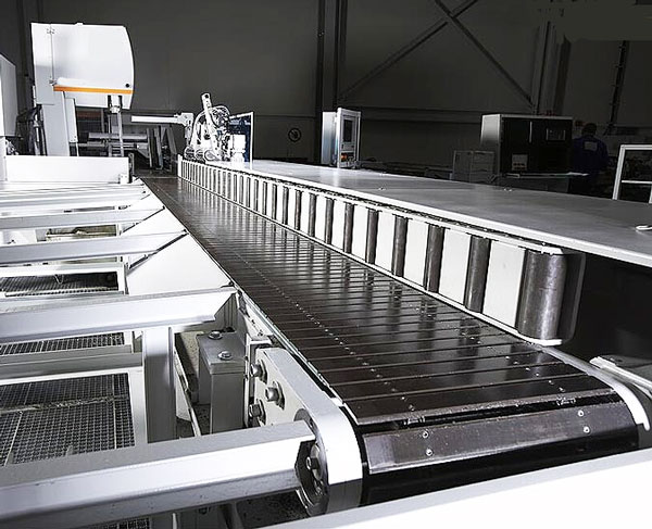 - Le pousseur évacue les pièces coupées sur le convoyeur dans le sens du flux matière, elles sont transportées jusqu'à l'endroit choisi pour être évacuées ou basculées à droite ou à gauche dans les bacs.