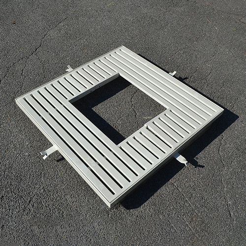 plans et détails) - NB. Une grille aura un format particulier. - Grille en acier inoxydable (RAL à définir), constituée de plats sur chant en acier massif. - Le châssis sera renforcé, sans trappe d’irrigation. - Les découpes des grilles répondront aux exigences des normes PMR