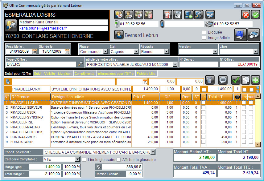 Besoin d"une solution informatique permettant de créer, d"éditer, de personnaliser et d"envoyer des proposition commerciale. Cette solution informatique doit également prendre en charge les outils de gestion commerciale classique : classification des produits, calcul des marge, gestion des clients, gestion des relances etc ...