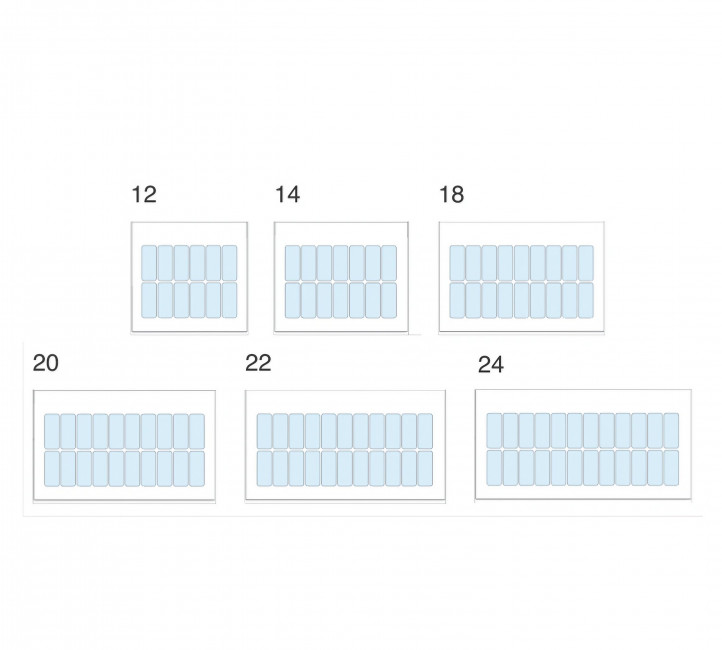 Disponible en versions 12, 16, 18, 22 ou 24 bacs inox 5 L (non fournis), la gamme suit l'évolution de votre carte sans changer de matériel glacier.