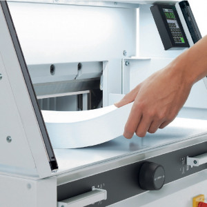Déplacement Précis de la Butée Arrière : La butée arrière est déplacée par un bouton moleté électronique à l'avant du massicot, permettant un positionnement exact pour des coupes précises.