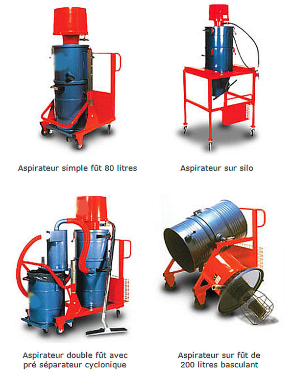 - Aspiration de tous types de produits : poudre, peinture, talc, plâtre, ciment, suie, sable, grenaille, corindon, calamine, solvants, huiles, boues, etc ...