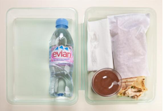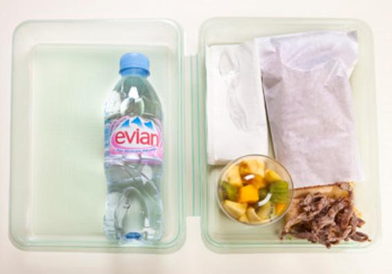 Sandwich express boeuf : Fatayer aux épinards (2 pièces) + ui sandwich au pain libanais (chawarma de boeuf sur un lit de hommos et de salade orientale) + un Evian 33cl + salade de fruits de saison.