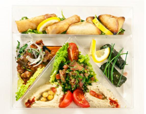 Mezzé Express : Moussaka, Tabbouli, Hommos, Warak énab, Moutabal, Fatayer aux épinards (2 pièces), Rikakat aux légumes (2 pièces) + Evian 33cl + Mouhallabé.