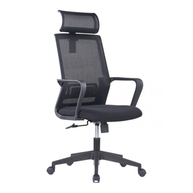 Ce fauteuil de bureau en tissu et résille combine une assise tapissée en tissu noir avec une mousse de 45 mm d’épaisseur et une densité de 60 kg/m³.