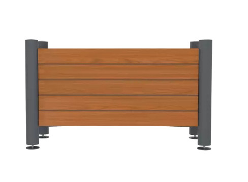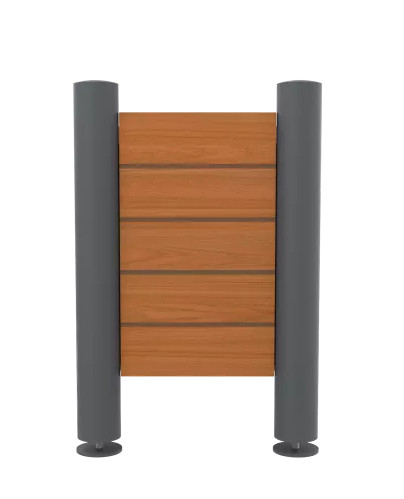 Elle associe une structure en acier traité anticorrosion et poudré anti-UV à un habillage en compact HPL finition effet lames, pour un rendu contemporain adapté aux projets de mobilier urbain.