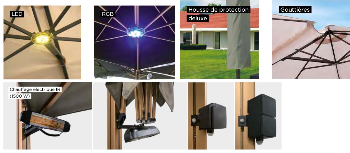 - Gouttières pluie (couleur de la toile du parasol) à zip
