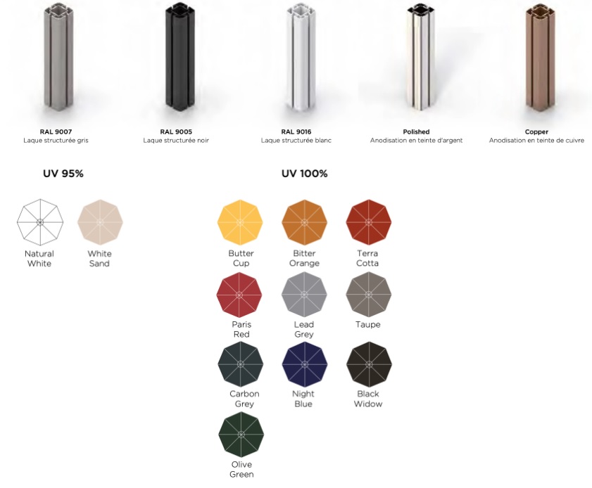 L'équilibre parfait du parasol est maintenu par un vérin à gaz en acier inoxydable, qui compense le poids de la toile.