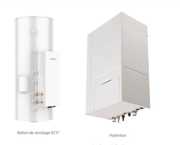 Une version tout-en-un, qui est une pompe à chaleur avec une unité intérieure intégrant un ballon d'eau chaude sanitaire de 185 litres.