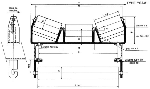 Support à rouleau auge Caractéristiques générales : Supports pour rouleaux, D = 60 et 70, axe 15 méplats 8, Norme E 53300 – α = 20 ou 30° en