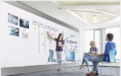 En raison de l’absence de cadre en aluminium, il est possible de placer plusieurs panneaux les uns à côté des autres ou les uns en dessous des autres pour créer un grand mur de tableaux blancs sans discontinuités. Les tableaux s’enchaînent presque sans discontinuité et forment un tout.