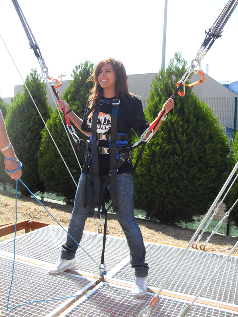 Au centre de la structure, l'utilisateur prend place, le technicien lui pose un harnais muni de bretelles qui est retenu au socle du