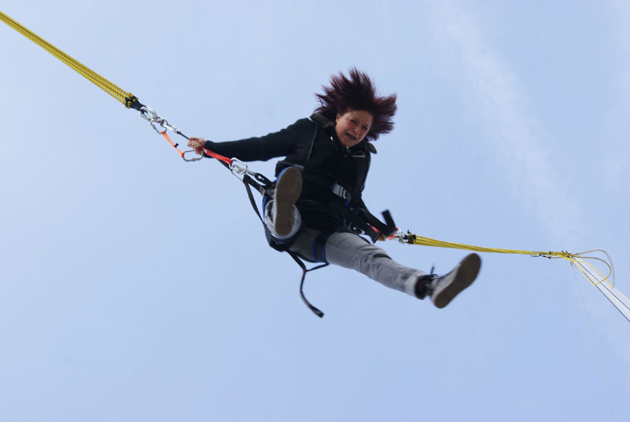 Bungee Ejection par l'intermédiaire d'un «crochet largeur ». De chaque côté du harnais les élastiques sont reliés aux cordes qui sont elles même reliés à un treuil électrique.