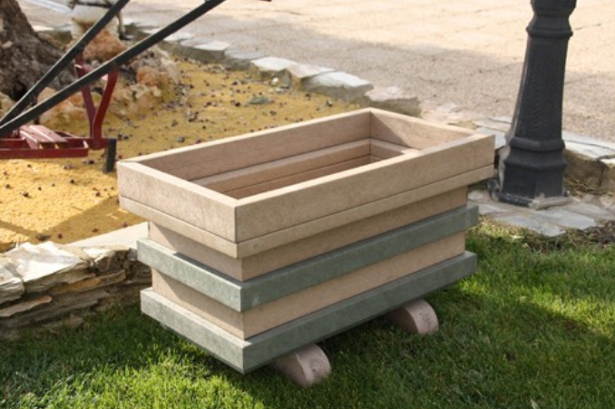 Cette jardinière en plastique recyclé est destinée à accueillir des fleurs ou des plantes décoratives.