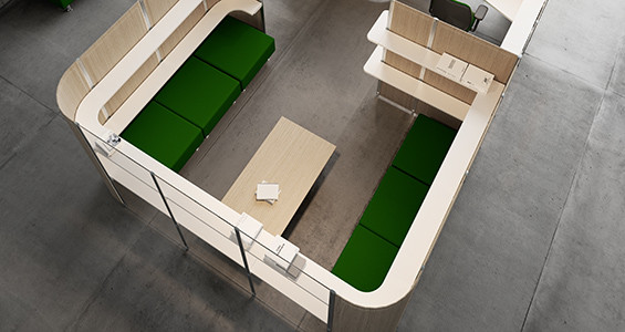 et d’une zone réservée aux réunions et composé de panneaux (T949S), de bureaux (T949P) et d’étagères (T949M),