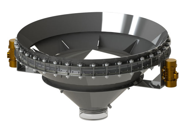 - Constitué d’un cône en acier au carbone ou inoxydable, d’une bande d’étanchéité tenue entre contre-brides, des suspensions et un ou deux moteurs à balourds.