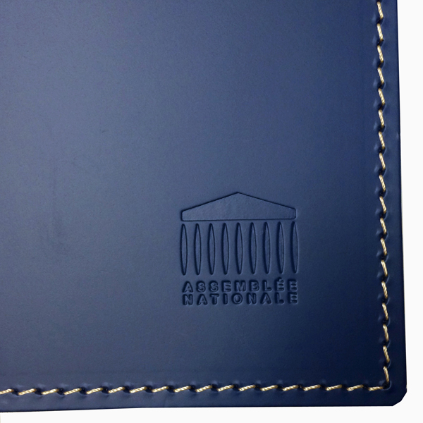 Personnalisations : marquage à chaud du cuir, en creux ou en couleur, choix du coloris pour le fil. En option au dos : marquage en creux "Fabriqué en France, Fibres de cuir recyclées".