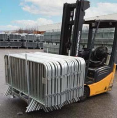 Cette palette porte-barrières est manipulable au transpalettes, gerbeurs ou chariots élévateurs.