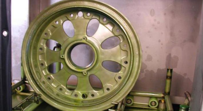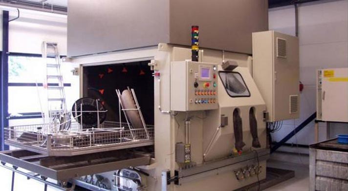 Cette machine de nettoyage a deux positions de chargement pour le chargement et le déchargement pendant que le cycle de lavage est en train et doit répondre aux exigences de pureté hautes, parce qu'après le nettoyage de roues d’avion, un NDI (pénétrant fluor) est effectué.