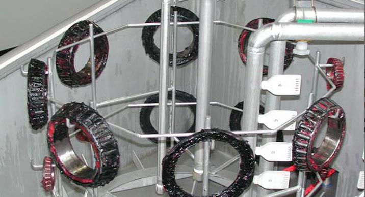 En outre, il y a un certain nombre de stations pour l’égouttage et le séchage. Une machine au trempe contient du fluor pénétrant pour détecter des déchirures. A la fin de la ligne le contrôle sous éclairage ultraviolet a lieu.